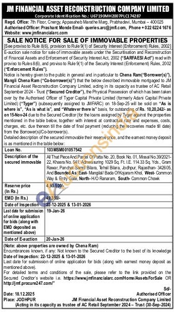 All That Piece And Parcel Of Patta No. 20, Book No. 01, Missal No.39/2021-22, Khasra No. 541, Admeasuring 1029 Sq. Ft. IE. 114.33 Sq. Yds, Gram Rawar, Panchat Samiti Bilara. Tehsil Bilara, Jodhpur, Rajasthan- 342605. And Bounded As: East- Mangilal/ Bada OfKojaram Khol, West- Common Way & Entry Gate, North-H/O Ranaram, South Common Chowk