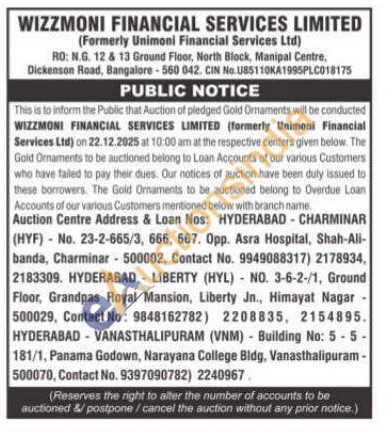 Wizzmoni Financial Services Limited Gold Auctions Auction in Hyderabad