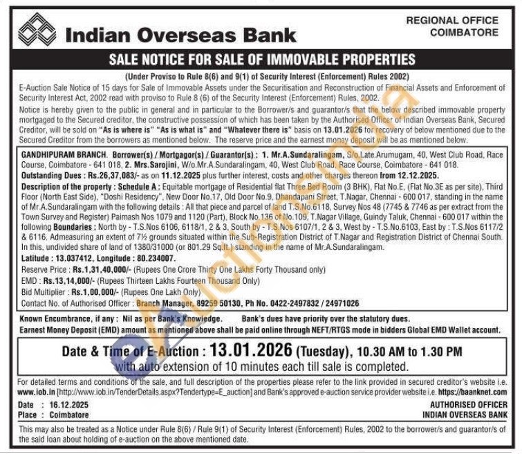 Equitable mortgage of Residential flat Three Bed Room (3 BHK), Flat No.E. (Flat No.3E as per site). Third Floor (North East Side), "Doshi Residency". New Door No.17, Old Door No.9. Dhandapani Street, T.Nagar, Chennai-600 017, standing in the name of Mr.A.Sundaralingam with the following details: All that piece and parcel of land T.S.No.6118, Survey Nos 48 (7745 & 7746 as per extract from the Town Survey and Register) Paimash Nos 1079 and 1120 (Part), Block No. 136 of No. 109, T. Nagar Village, Guindy Taluk, Chennai-600 017 within the following Boundaries: North by -T.S.Nos 6106, 6118/1, 2 & 3, South by T.S.Nos 6107/1, 2 & 3, West by -T.S.No.6103, East by: T.S.Nos 6117/2 & 6116. Admeasuring an extent of 7½ grounds situated within the Sub-Registration District of T. Nagar and Registration District of Chennai South. In this, undivided share of land of 1380/31000 (or 801.29 Sq.ft.) standing in the name of Mr.A Sundaralingam. Latitude: 13.037412, Longitude: 80.234007.