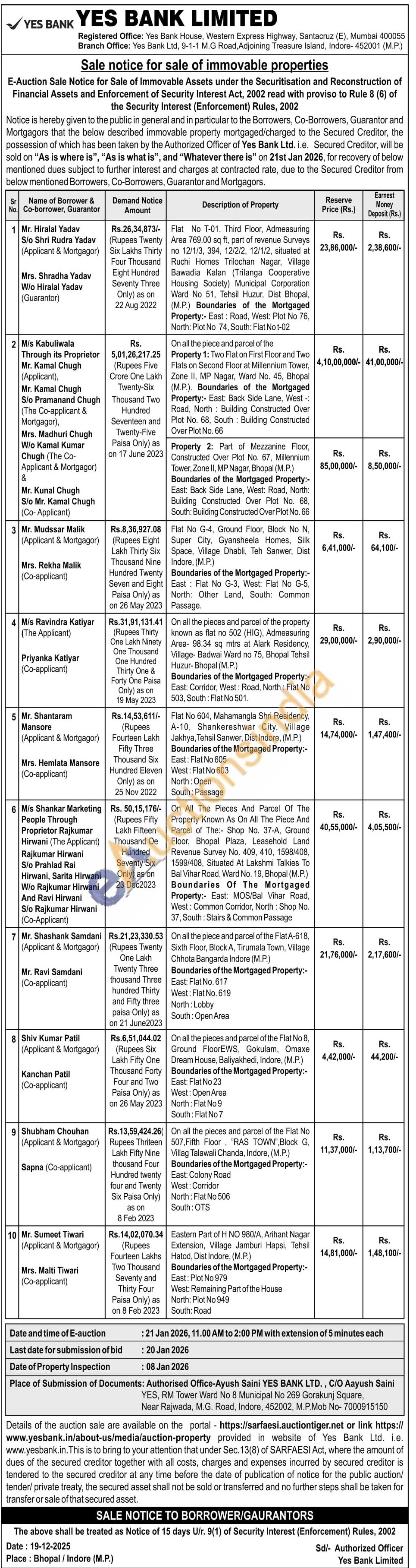 On all the piece and parcel of the FlatA-618, Sixth Floor, Block A, Tirumala Town, Village Chhota Bangarda Indore (M.P.) Boundaries of the Mortgaged Property:- ast: Flat No. 617 West: Flat No. 619 North: Lobby South: Open Area