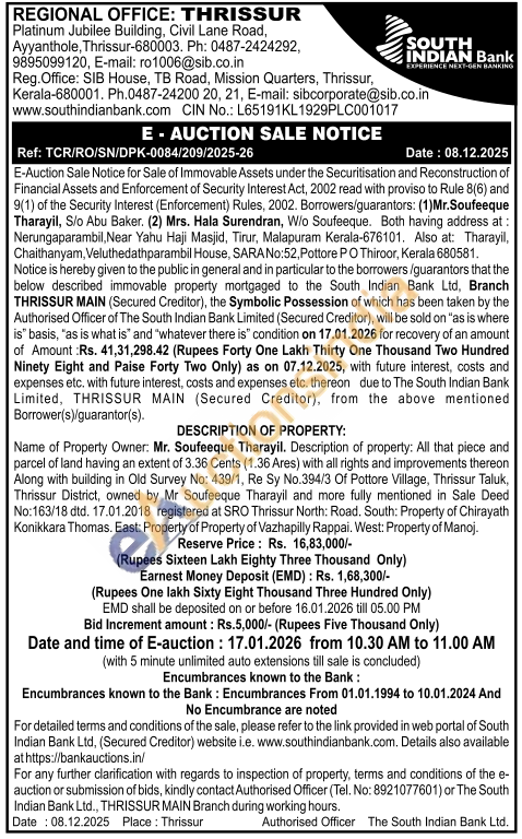 Name of Property Owner: Mr. Soufeeque Tharayil. Description of property: All that piece and parcel of land having an extent of 3.36 Cents (1.36 Ares) with all rights and improvements thereon Along with building in Old Survey No: 439/1, Re Sy No.394/3 Of Pottore Village, Thrissur Taluk, Thrissur District, owned by Mr Soufeeque Tharayil and more fully mentioned in Sale Deed No: 163/18 dtd. 17.01.2018 registered at SRO Thrissur North: Road. South: Property of Chirayath Konikkara Thomas. East: Property of Property of Vazhapilly Rappai. West: Property of Manoj.
