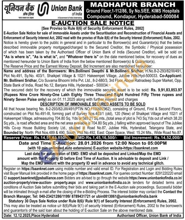 All that house bearing No. 8-2-293/82/JIII/491(PTIN NO.1100887962), consisting of Ground, First & Second Floors, constructed on Plot No.491-III, forming part of Survey Nos.403/1 (old), 120 (New) of Shaikpet Village and 102/1 of Hakeempet Village, admeasuring 704.80 Sq. Yds or 589.21 Sq.mts., (total area of plot is 743 Sq. Yds out of which 38.20 Sq.yds., is road affected area and the net area available is 704.80 Sq.yds.,) falling within approved layout of The Jubilee Hills Co-op House Building Society Ltd., situated at Road No.87, Jubilee Hills, Hyderabad, Telangana State, and Bounded by: North: Plot Nos.489 & 490, South; Plot No.492, East: Open Space, West: 15.24 Mts., Wide Road No.87