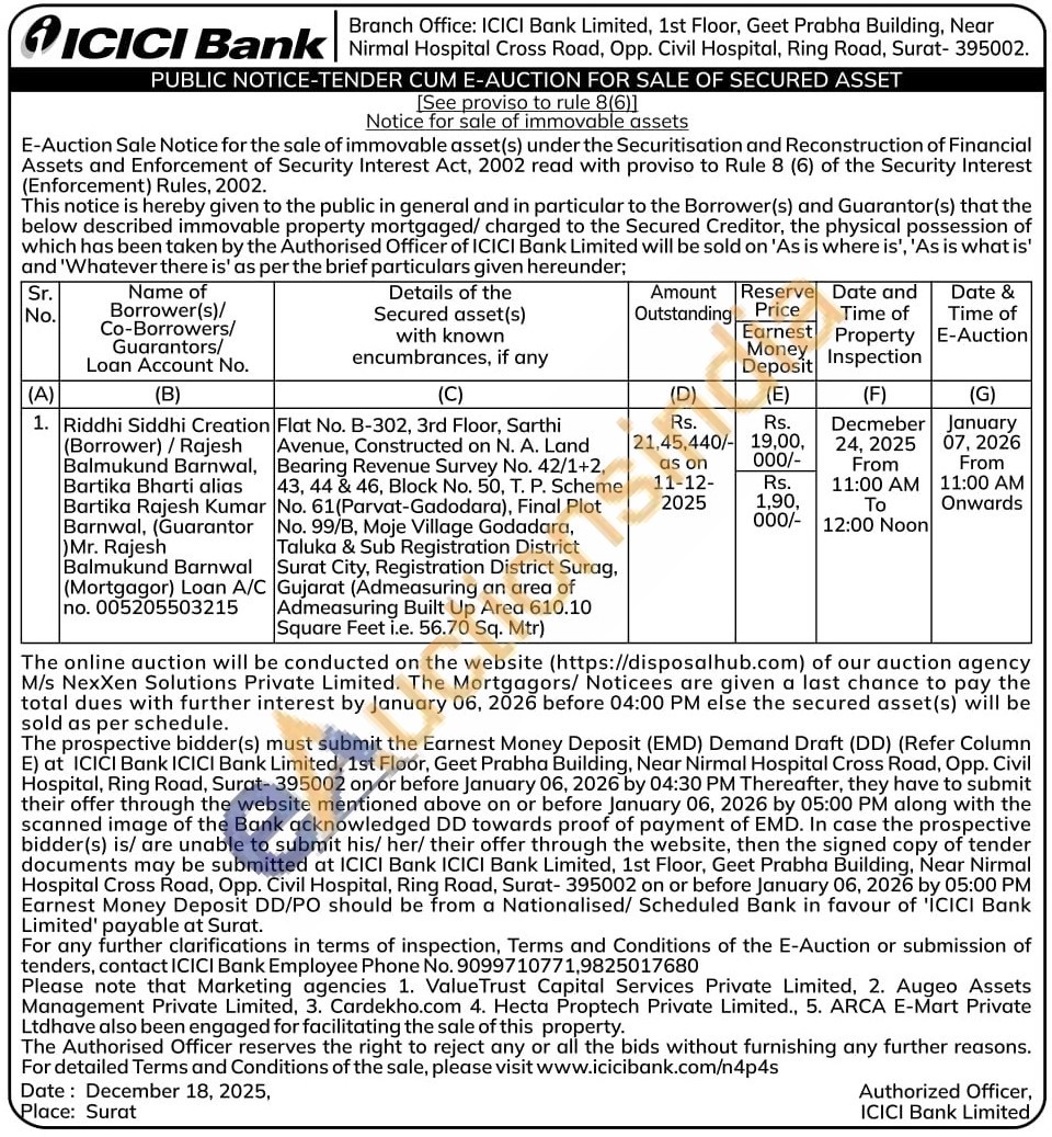 Flat No. B-302, 3rd Floor, Sarthi Avenue, Constructed on N. A. Land Bearing Revenue Survey No. 42/1+2, 43, 44 & 46, Block No. 50, T. P. Scheme No. 61 (Parvat-Gadodara), Final Plot No. 99/B, Moje Village Godadara, Taluka & Sub Registration District Surat City, Registration District Surag, Gujarat (Admeasuring an area of Admeasuring Built Up Area 610.10 Square Feet i.e. 56.70 Sq. Mtr)