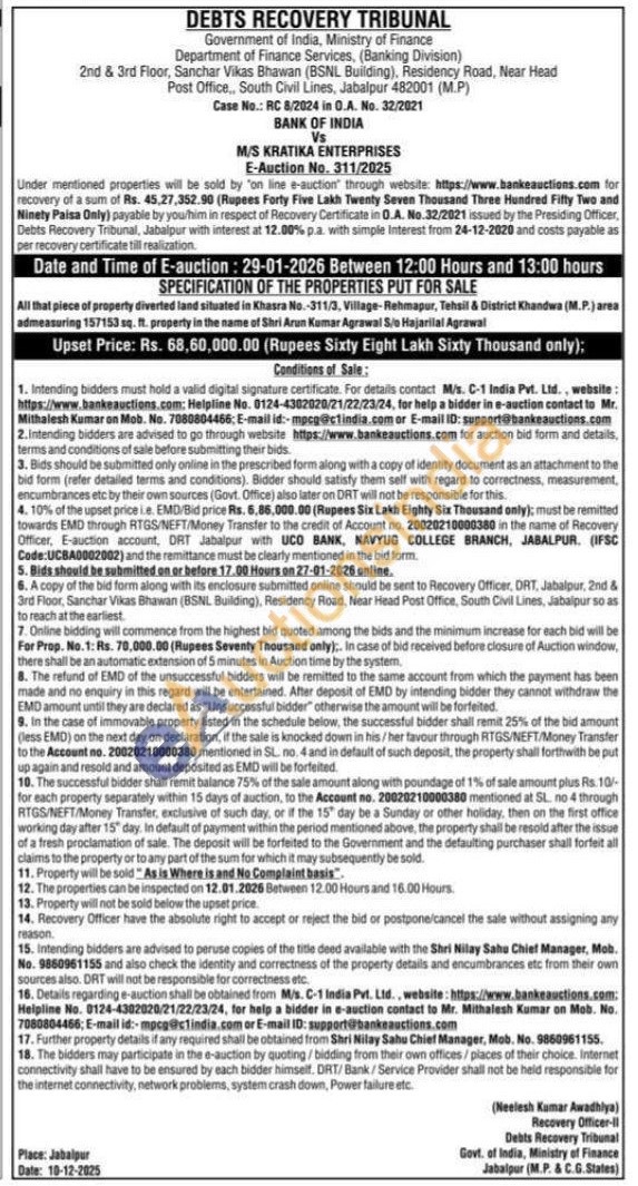 All that piece of property diverted land situated in Khasra No.-311/3, Village-Rehmapur, Tehsil & District Khandwa (M.P.) area admeasuring 157153 sq. ft. property in the name of Shri Arun Kumar Agrawal S/o Hajarilal Agrawal