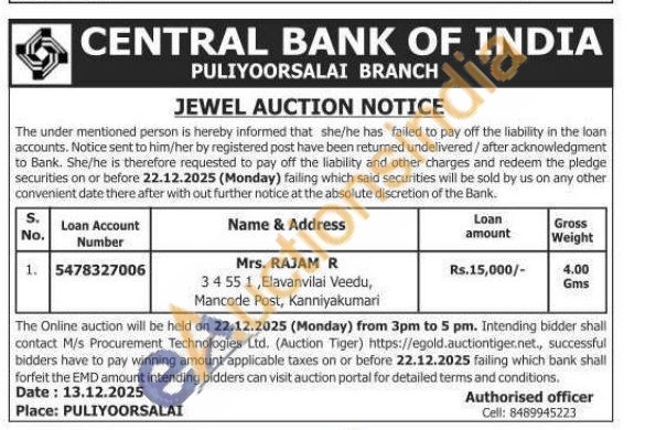 Central Bank of India Gold Auctions Auction in Kanyakumari