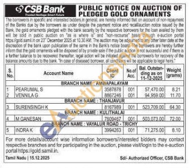 CSB Bank Gold Auctions Auction in Thanjavur