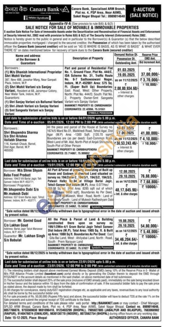 All Part &Parcel of property consisting of Built up House and Godown at diverted Land situated on survey no. 194/2min-2, 194/3/1, 194/3/2, 194/3/3 Patwari Halka No.54 at Village Bartai Jagir, Tehsil-Sanwer Dist Indore (M.P). Area: 0.077 Нес 769.98 So mt. Plot Area: 8285 saft out of which Building Area: 5900 sqft, Boundaries As Per Deed. East Land of Mukesh West Road, North: Land of Premsingh, South: Land of Mukesh Radheshyam Dab BAANKNET PROPERTY ID: CARESHYAMBABA COORDINATES: 22.54062, 75.56542