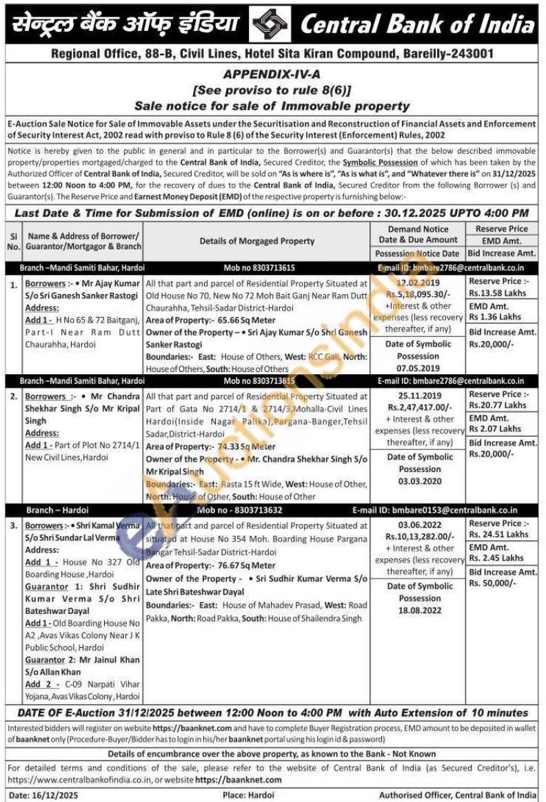 All that part and parcel of Residential Property Situated at Old House No 70, New No 72 Moh Bait Ganj Near Ram Dutt Chaurahha, Tehsil-Sadar District-Hardoi Area of Property: 65.66 5q Meter Owner of the Property Sri Ajay Kumar 5/o Shri Ganesh Sanker Rastogi Boundaries: East: House of Others, West: RCC Gali, North: House of Others, South: House of Others