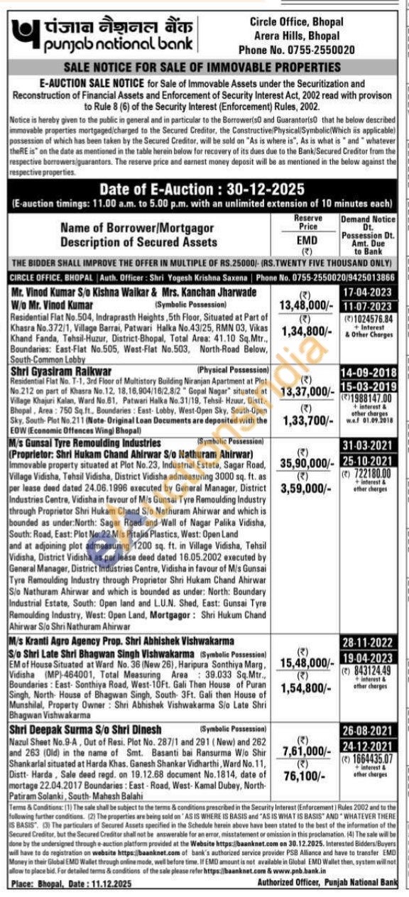 Proprietor: Shri Hukam Chand Ahirwar S/o Nathuram Ahirwar) Immovable property situated at Plot No.23, Industrial Estate, Sagar Road, Village Vidisha, Tehsil Vidisha, District Vidisha admeasuring 3000 sq. ft. as per lease deed dated 24.06.1996 executed by General Manager, District Industries Centre, Vidisha in favour of Mis Gunsai Tyre Remoulding Industry through Proprietor Shri Hukam Chand S/o Nathuram Ahirwar and which is bounded as under: North: Sagar Road and Wall of Nagar Palika Vidisha, South: Road, East: Plot No.22 M/s Pitalia Plastics, West: Open Land and at adjoining plot admeasuring 1200 sq. ft. in Village Vidisha, Tehsil Vidisha, District Vidisha as per lease deed dated 16.05.2002 executed by General Manager, District Industries Centre, Vidisha in favour of M/s Gunsai Tyre Remoulding Industry through Proprietor Shri Hukam Chand Ahirwar S/o Nathuram Ahirwar and which is bounded as under: North: Boundary Industrial Estate, South: Open land and L.U.N. Shed, East: Gunsai Tyre Remoulding Industry, West: Open Land, Mortgagor: Shri Hukum Chand Ahirwar Sio Shri Nathuram Ahirwar