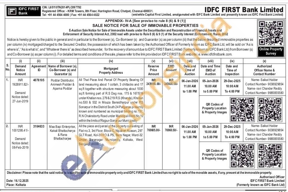 All the piece and parcel of the property consisting of Flat no.3, 3rd Floor, Block-C, Nipaban Abasan, 297 GLT Road, Kol-36 PO & PS, Bara Nagar, Ward-32 Under Baranagar Muncipality, Kolkata, West Bengal, 700036