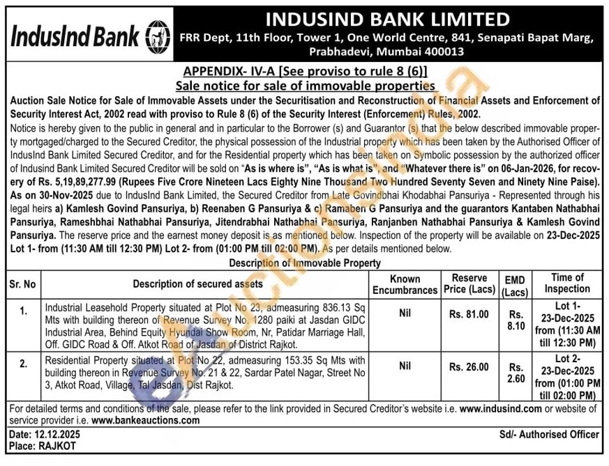 Industrial Leasehold Property situated at Plot No 23, admeasuring 836.13 Sq Mts with building thereon of Revenue Survey No. 1280 paiki at Jasdan GIDC Industrial Area, Behind Equity Hyundai Show Room, Nr, Patidar Marriage Hall, Off. GIDC Road & Off. Atkot Road of Jasdan of District Rajkot.