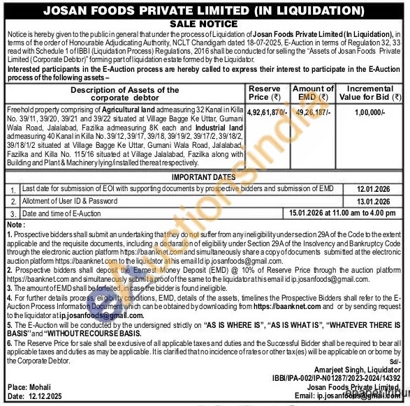 Freehold property comprising of Agricultural land admeasuring 32 Kanal in Killa No. 39/11, 39/20, 39/21 and 39/22 situated at Village Bagge Ke Uttar, Gumani Wala Road, Jalalabad, Fazilka admeasuring 8K each and Industrial land admeasuring 400 Kanal in Killa No. 39/12, 39/17,39/18, 39/19/2, 39/17/2, 39/18/2, 39/18/1/2 situated at Village Bagge Ke Uttar, Gumani Wala Road, Jalalabad, Fazilka and Killa No. 115/16 situated at Village Jalalabad, Fazilka along with Building and Plant & Machinery lying/installed there at respectively.