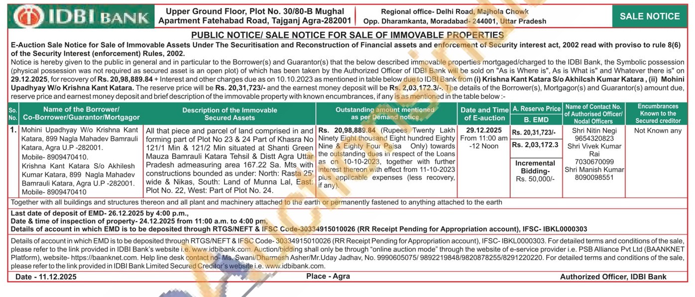 All that piece and parcel of land comprised in and forming part of Plot No 23 & 24 Part of Khasra No 121/1 Min & 121/2 Min situated at Shanti Green Mauza Bamrauli Katara Tehsil & Distt Agra Uttar Pradesh admeasuring area 167.22 Sa. Mts with constructions bounded as under: North: Rasta 25' wide & Nikas, South: Land of Munna Lal, East: Plot No. 22, West: Part of Plot No. 24.