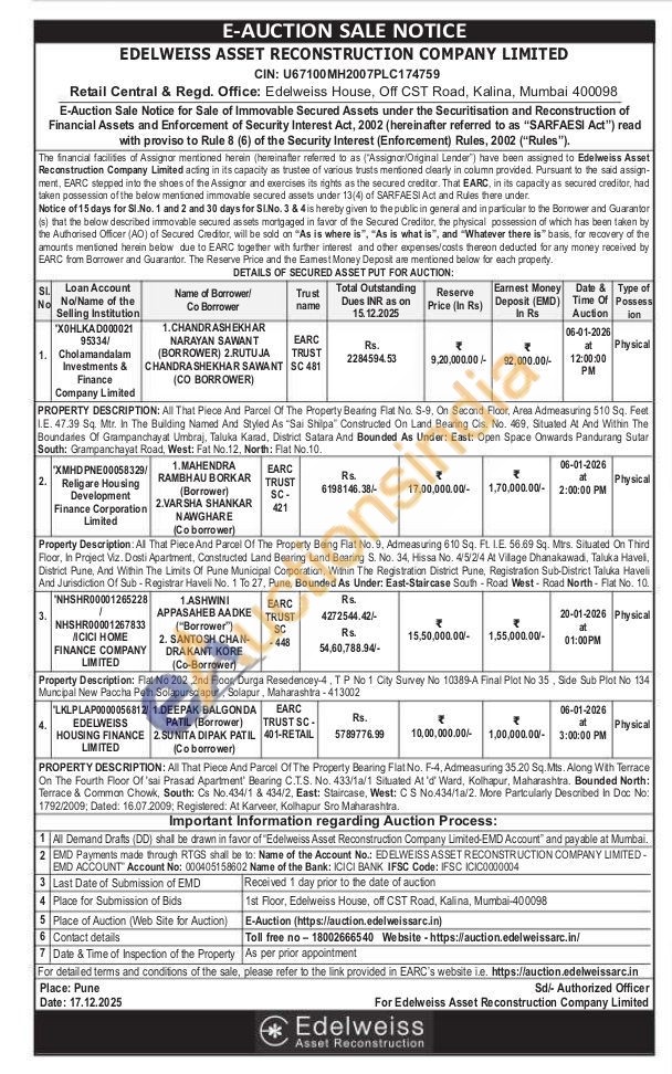 PROPERTY DESCRIPTION: All That Piece And Parcel Of The Property Bearing Flat No. S-9, On Second Floor, Area Admeasuring 510 Sq. Feet. LE. 47.39 Sq. Mtr. In The Building Named And Styled As "Sai Shilpa" Constructed On Land Bearing Cis. No. 469, Situated At And Within The Boundaries Of Grampanchayat Umbraj, Taluka Karad, District Satara And Bounded As Under: East: Open Space Onwards Pandurang Sutar South: Grampanchayat Road, West: Fat No.12, North: Flat No.10.