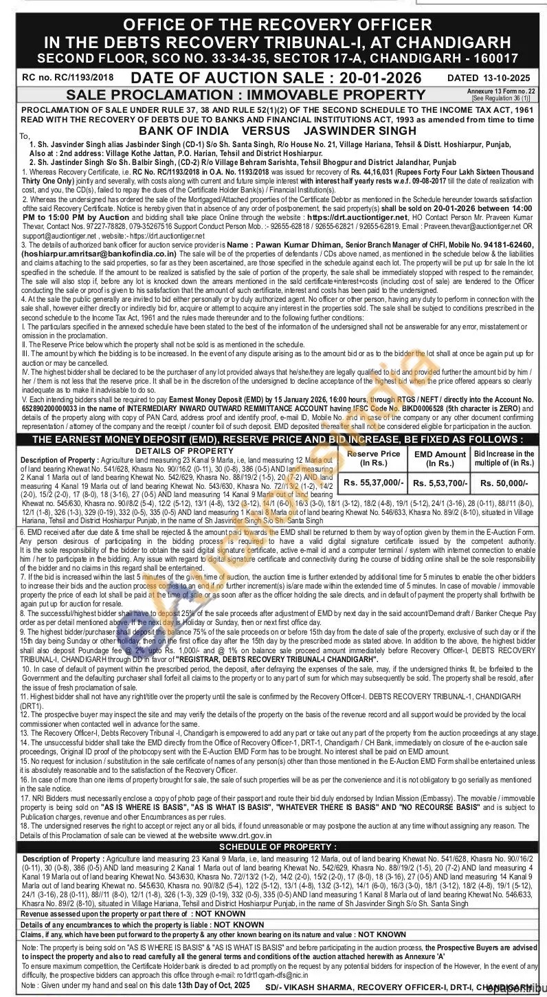 Description of Property Agricuture ng 23 Kanal 9 Maria, ie, land measuring 17 17 Maria out of land bearing Khewat No. 541/628, Khasra No. 90/16.2 (0-11) 30 (0-0) 2 Kanal 1 Marla out of land bearing Khewat No. 542/629, Khasra No. 88/19/2 (1-5) 20 (7-2) AND land measuring & Karal 19 Martia out of land bearing Khewat No. 543/830. Khasra No. 72/132 (1-2) 142 (2-0), (2-0), 17 (8-0) 18 (3-16), 27 (0-6) AND land measuring 14 Kanal 9 Maria out of land bearing masing Khewal no. 545/630, Khasta no. 90/8/2 (5-4), 12/2 (5-12), 13/1 (4-8), 13/2(3-12), 14/1 (6-0), 16/3 (3-0), 18/1 (3-12), 182 (4-8), 19/1 (5-12) 24/1 (3-16), 28 (0-11), 88011 (8-0), 12/1 (1-0), 326 (1-3), 329 (0-19), 332 (0-5), 335 (0-5) AND land measuring 1 Kanal & Marla out of land bearitig Khewat No. 546/633, Khasra No. 8912 (8-10), situated in Vilage Harare, Tensil and District Hoshiarpur Punjab, in the name of Sh Jasvinder Singh Sic Sn Santa Singh