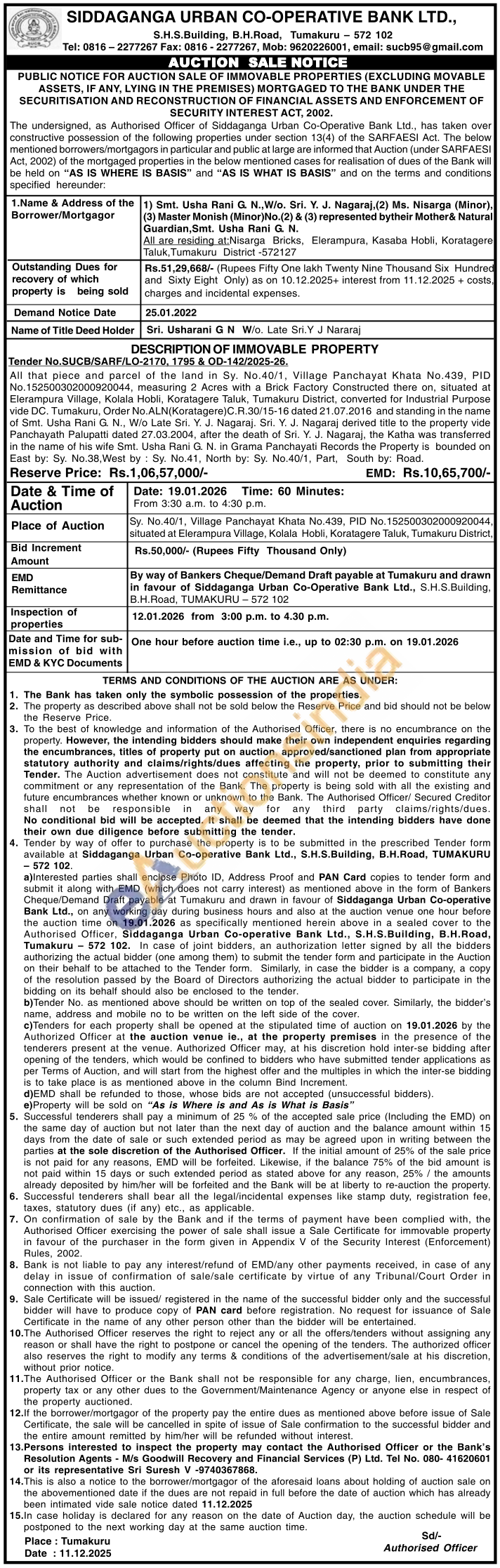 All that piece and parcel of the land in Sy. No.40/1, Village Panchayat Khata No.439, PID No.152500302000920044, measuring 2 Acres with a Brick Factory Constructed there on, situated at Elerampura Village, Kolala Hobli, Koratagere Taluk, Tumakuru District, converted for Industrial Purpose vide DC. Tumakuru, Order No.ALN (Koratagere) C.R.30/15-16 dated 21.07.2016 and standing in the name of Smt. Usha Rani G. N., W/o Late Sri. Y. J. Nagaraj. Sri. Y. J. Nagaraj derived title to the property vide Panchayath Palupatti dated 27.03.2004, after the death of Sri. Y. J. Nagaraj, the Katha was transferred in the name of his wife Smt. Usha Rani G. N. in Grama Panchayati Records the Property is bounded on East by: Sy. No.38, West by: Sy. No.41, North by: Sy. No.40/1, Part, South by: Road.