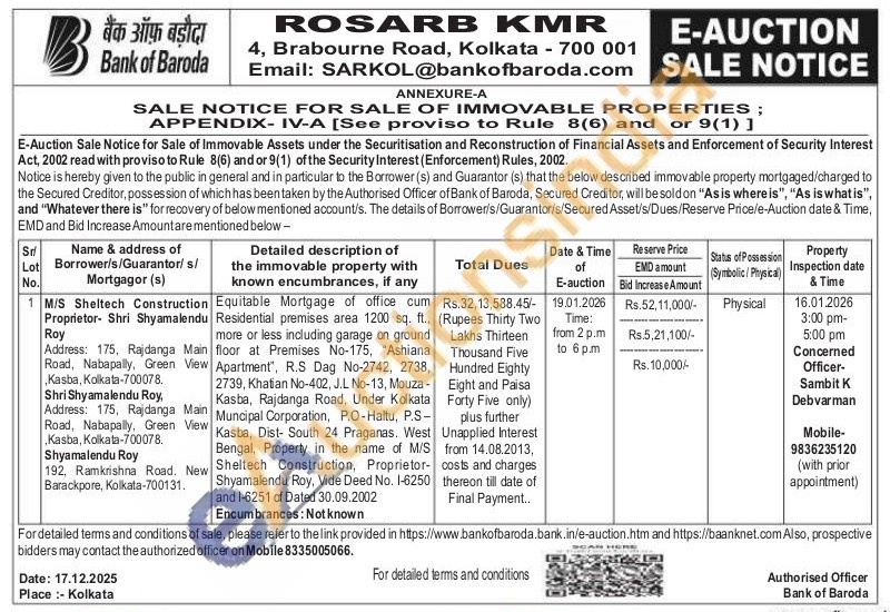Equitable Mortgage of office cum Residential premises area 1200 sq. ft., more or less including garage on ground floor at Premises No-175, "Ashiana Apartment", R.S Dag No-2742, 2738, 2739, Khatian No-402, J.L No-13, Mouza -Kasba, Rajdanga Road, Under Kolkata Muncipal Corporation, P.O-Haltu, P.S-Kasba, Dist- South 24 Praganas. West Bengal, Property in the name of M/S Sheltech Construction, Proprietor-Shyamalendu Roy, Vide Deed No. 1-6250 and 1-6251 of Dated 30.09.2002