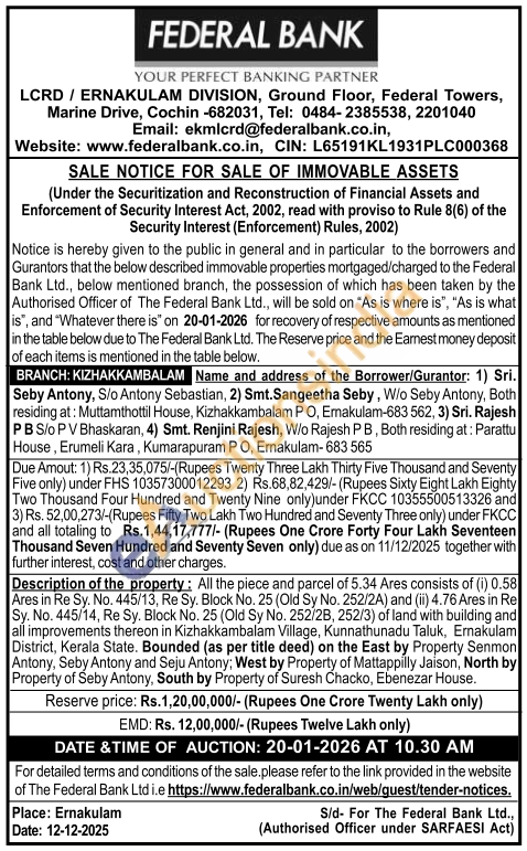 All the piece and parcel of 5.34 Ares consists of (i) 0.58 Ares in Re Sy. No. 445/13, Re Sy. Block No. 25 (Old Sy No. 252/2A) and (ii) 4.76 Ares in Re Sy. No. 445/14, Re Sy. Block No. 25 (Old Sy No. 252/2B, 252/3) of land with building and all improvements thereon in Kizhakkambalam Village, Kunnathunadu Taluk, Ernakulam District, Kerala State. Bounded (as per title deed) on the East by Property Senmon Antony, Seby Antony and Seju Antony; West by Property of Mattappilly Jaison, North by Property of Seby Antony, South by Property of Suresh Chacko, Ebenezar House