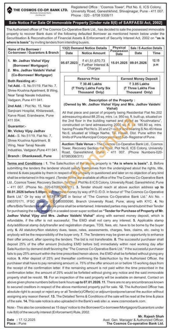 All that piece and parcel of property being Residential Flat No.202 admeasuring about 88.25 sq. mtrs. Le. 950 sq. ft. built up, situated on the 2nd floor in the building named and styled as "Krushnatanu". constructed on land admeasuring 2000 sq. ft. l.e. 185.80 sq. mtrs. having Private Plot No's. 20 and 21 out of land bearing S.No.45 Hissa No.6, situated at Village Narhe, Tal. Haveli, Dist. Pune within the limits of Pune Municipal Corporation and Sub-Registrar of Pune.