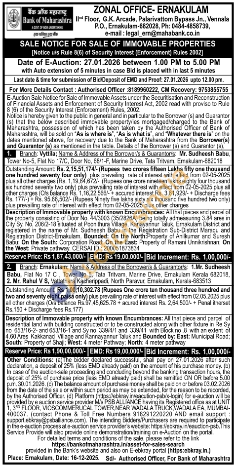 Description of Immovable property with known Encumbrances: All that piece and parcel of residential land with building constructed or to be constructed along with other fixture in Re Sy no 653/16-2-and 653/16-1 and Sy no 339/4/1 and 339/41 with Block no.8 with an extent of 4.60 Ares Kakkanad Village and Kannayannur Taluk and Bounded by: East: Municipal Road; South: Property of Shaji; West: 4 meter Pathway; North: 4 meter pathway