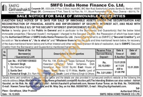Plot No. 194, Keshopur, Tappa Gahasad, Pargana Hasanpur Maghar, Tahsil Sahjanwa, Distt Gorakhpur, Area- 52.52 Sq.mtr. East: House of Mannu, West: Rasta 12 Ft Wide, North: Land of Ram Bharat, South: Land of Manoj Singh & Others.