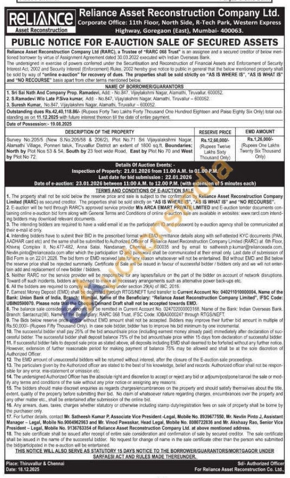 Survey No.205/5 (New S.No.205/58 & 206/2), Plot No.71 Sri Vijayalakshmi Nagar, Alamathi Village, Ponneri taluk, Tiruvallur District an extent of 1800 sq.ft. Boundaries; North by Plot Nos 53 & 54, South by 23 feet wide Road, East by Plot No 70 and West by Plot No 72.