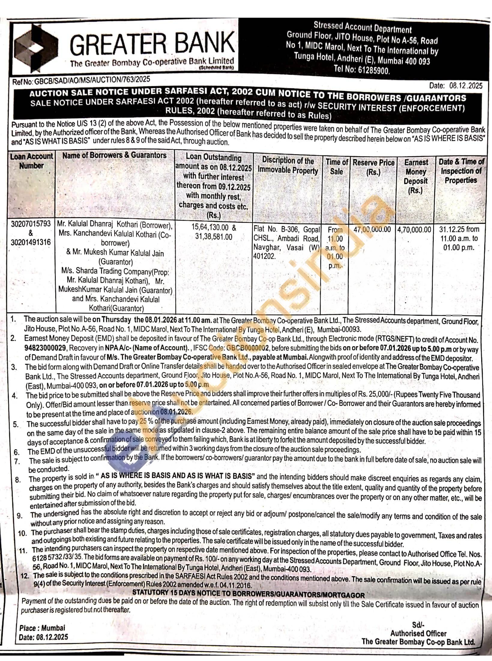 Flat No. B-306, Gopal CHSL., Ambadi Road, Navghar, Vasai (W) 401202.
