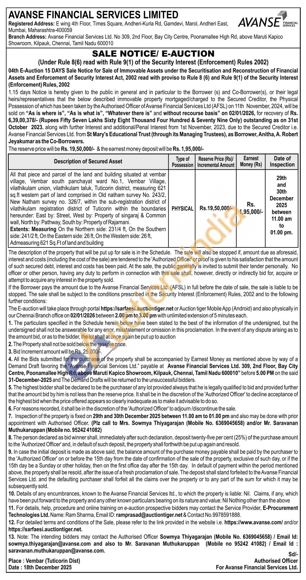 All that piece and parcel of the land and building situated at vembar village. Vembar south panchayat ward No.1, Vembar Village, vilathikulam union, vilathikulam taluk, Tuticorin district, measuring 621 sq.ft western part of land comprised in Old natham survey No. 243/2, New Natham survey no. 326/7, within the sub-registration district of vilathikulam registration district of Tuticorin within the boundaries hereunder. East by: Street, West by: Property of singaraj & Common wall, North by: Pathway, South by: Property of RajamaniExtents: Measuring On the Northem side: 231/4 ft. On the Southern side: 241/2 ft, On the Eastern side: 26 ft, On the Western side: 26 ft, Admeasuring 621 Sq. Ft of land and building