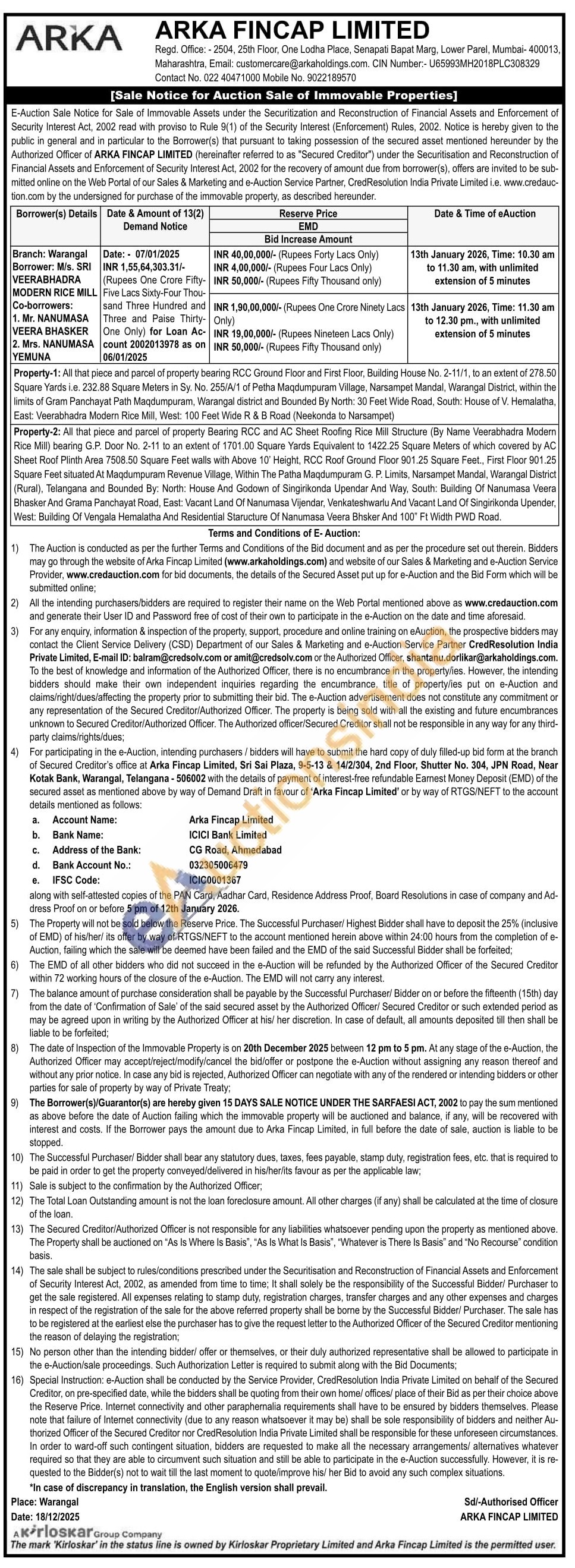 Property-1: All that piece and parcel of property bearing RCC Ground Floor and First Floor, Building House No. 2-11/1, to an extent of 278.50 Square Yards i.e. 232.88 Square Meters in Sy. No. 255/A/1 of Petha Maqdumpuram Village, Narsampet Mandal, Warangal District, within the limits of Gram Panchayat Path Maqdumpuram, Warangal district and Bounded By North: 30 Feet Wide Road, South: House of V. Hemalatha, East: Veerabhadra Modern Rice Mill, West: 100 Feet Wide R & B Road (Neekonda to Narsampet)