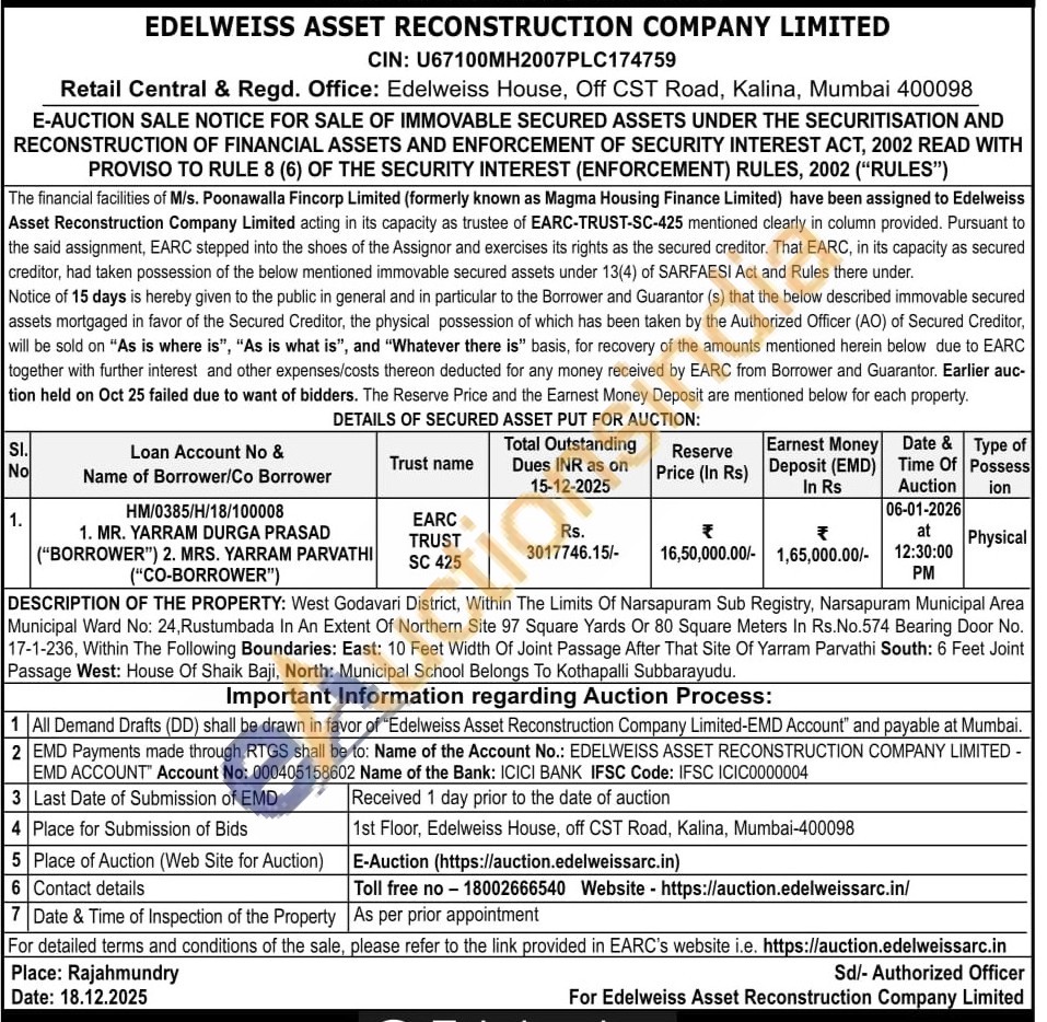 DESCRIPTION OF THE PROPERTY: West Godavari District, Within The Limits Of Narsapuram Sub Registry, Narsapuram Municipal Area Municipal Ward No: 24, Rustumbada In An Extent Of Northern Site 97 Square Yards Or 80 Square Meters In Rs.No.574 Bearing Door No. 17-1-236, Within The Following Boundaries: East: 10 Feet Width Of Joint Passage After That Site Of Yarram Parvathi South: 6 Feet Joint Passage West: House Of Shaik Baji, North: Municipal School Belongs To Kothapalli Subbarayudu.