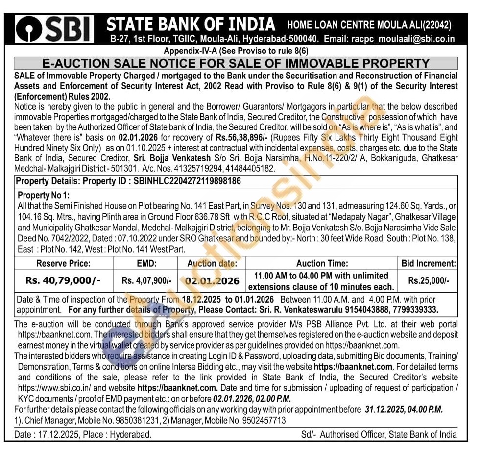 All that the Semi Finished House on Plot bearing No. 141 East Part, in Survey Nos. 130 and 131, admeasuring 124.60 Sq. Yards., or 104.16 Sq. Mtrs., having Plinth area in Ground Floor 636.78 Sft with R.C.C Roof, situated at "Medapaty Nagar", Ghatkesar Village and Municipality Ghatkesar Mandal, Medchal- Malkajgiri District, belonging to Mr. Bojja Venkatesh S/o. Bojja Narasimha Vide Sale Deed No. 7042/2022, Dated: 07.10.2022 under SRO Ghatkesar and bounded by:- North: 30 feet Wide Road, South: Plot No. 138, East: Plot No. 142, West: Plot No. 141 West Part.