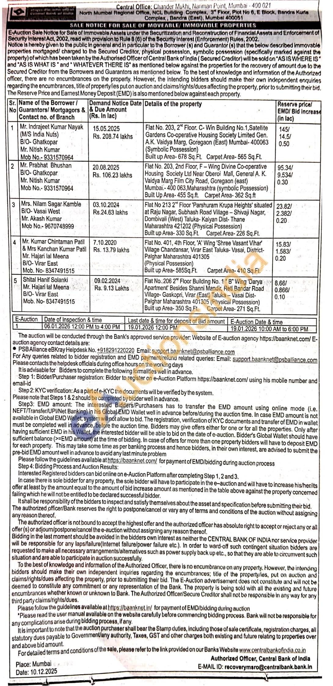 Flat No. 401, 4th Floor, 'A' Wing 'Shree Vasant Vihar Village Chandansar, Virar East Taluka- Vasai, District-Palghar Maharashtra 401305 Built up Area-585Sq.Ft. Carpet Area-410 Sq.Ft. (Physical Possession)