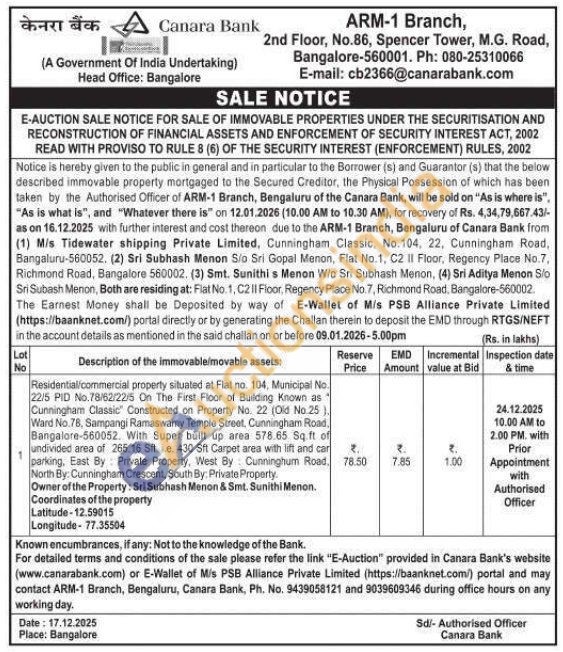 Residential/commercial property situated at Flat no. 104, Municipal No. 22/5 PID No.78/62/22/5 On The First Floor of Building Known as Cunningham Classic" Constructed on Property No. 22 (Old No.25) Ward No. 78, Sampangi Ramaswamy Temple Street, Cunningham Road, Bangalore-560052. With Super built up area 578.65 Sq ft of undivided area of 265.16 Sft. te. 430 Sft Carpet area with lift and car parking, East By Private Property, West By Cunninghum Road, North By: Cunningham Crescent, South By: Private Property. Owner of the Property: Sri Subhash Menon & Smt. Sunithi Menon. Coordinates of the property Latitude-12.59015