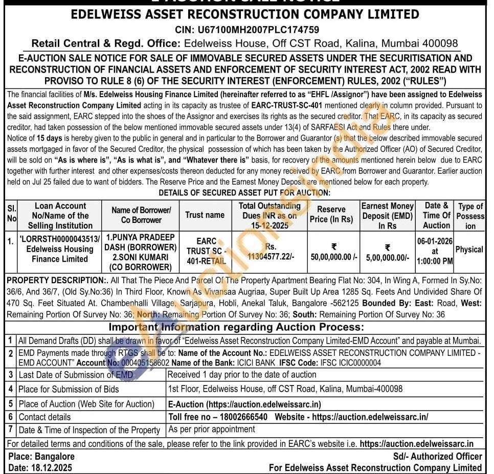 PROPERTY DESCRIPTION:. All That The Piece And Parcel Of The Property Apartment Bearing Flat No: 304, In Wing A, Formed In Sy.No: 36/6, And 36/7, (Old Sy. No:36) In Third Floor, Known As Vivansaa Augriaa, Super Built Up Area 1285 Sq. Feets And Undivided Share Of 470 Sq. Feet Situated At. Chambenhalli Village, Sarjapura, Hobli, Anekal Taluk, Bangalore -562125 Bounded By: East: Road, West: Remaining Portion Of Survey No: 36; North: Remaining Portion Of Survey No: 36; South: Remaining Portion Of Survey No: 36