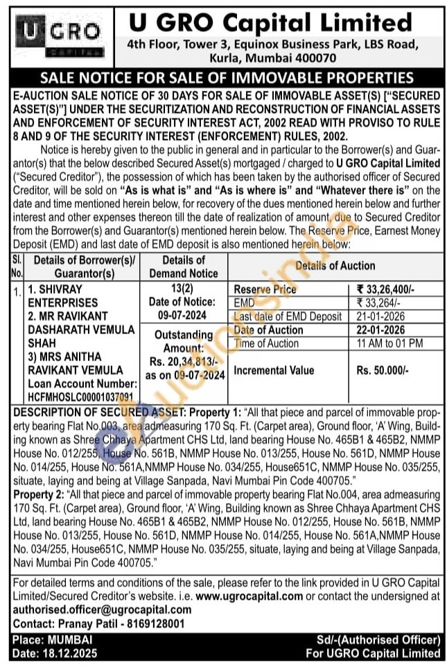 DESCRIPTION OF SECURED ASSET: Property 1: "All that piece and parcel of immovable prop-erty bearing Flat No.003, area admeasuring 170 Sq. Ft. (Carpet area), Ground floor, 'A' Wing, Build-ing known as Shree Chhaya Apartment CHS Ltd, land bearing House No. 465B1 & 465B2, NMMP House No. 012/255, House No. 561B, NMMP House No. 013/255, House No. 561D, NMMP House No. 014/255, House No. 561A, NMMP House No. 034/255, House651C, NMMP House No. 035/255, situate, laying and being at Village Sanpada, Navi Mumbai Pin Code 400705." Property 2: "All that piece and parcel of immovable property bearing Flat No.004, area admeasuring 170 Sq. Ft. (Carpet area), Ground floor, 'A' Wing, Building known as Shree Chhaya Apartment CHS Ltd, land bearing House No. 465B1 & 465B2, NMMP House No. 012/255, House No. 561B, NMMP House No. 013/255, House No. 561D, NMMP House No. 014/255, House No. 561A, NMMP House No. 034/255, House651C, NMMP House No. 035/255, situate, laying and being at Village Sanpada, Navi Mumbai Pin Code 400705."