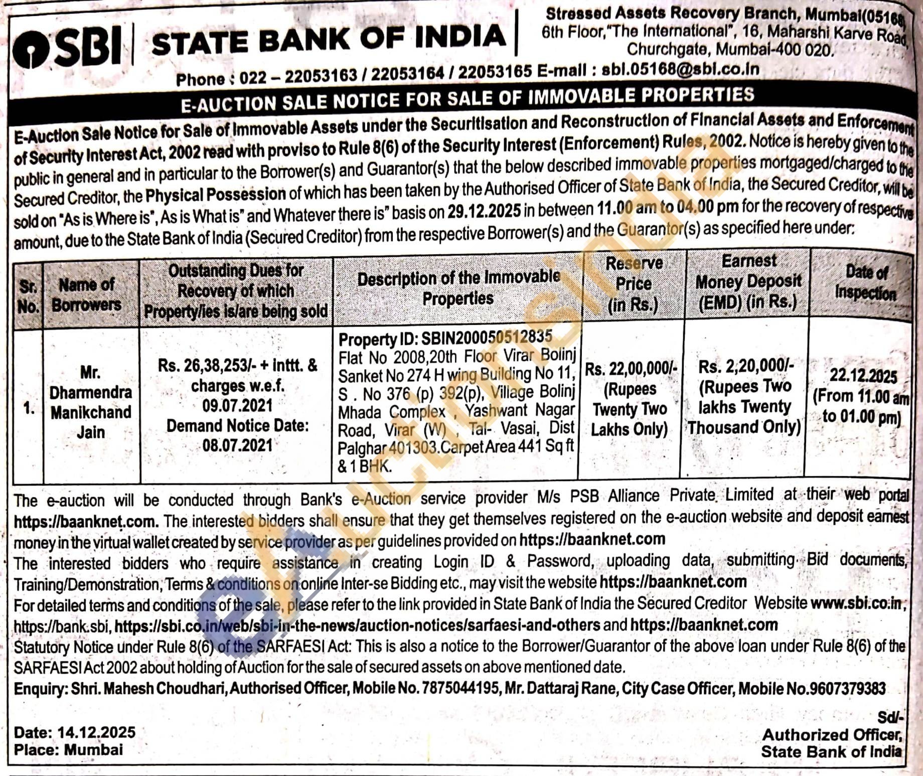 Flat No 2008,20th Floor Virar Bolinj Sanket No 274 H wing Building No 11, S. No 376 (p) 392(p), Village Bolinj Mhada Complex, Yashwant Nagar Road, Virar (W), Tal- Vasai, Dist Palghar 401303.Carpet Area 441 Sq ft & 1 BHK.