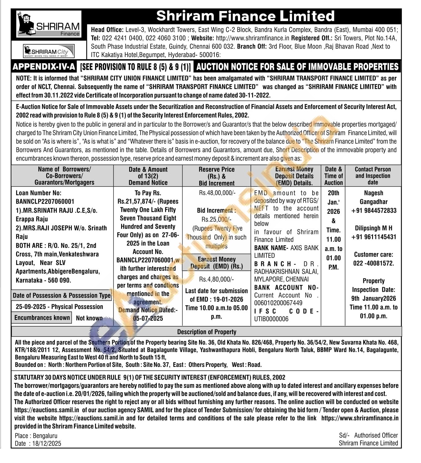 All the piece and parcel of the Southern Portion of the Property bearing Site No. 36, Old Khata No. 826/468, Property No. 36/54/2, New Suvarna Khata No. 468, KTR/188/2011 12, Assessment No. 54/2, Situated at Bagalagunte Village, Yashwanthapura Hobli, Bengaluru North Taluk, BBMP Ward No.14, Bagalagunte, Bengaluru Measuring East to West 40 ft and North to South 15 ft, Bounded on: North: Northern Portion of Site, South: Site No. 37, East: Others Property, West: Road