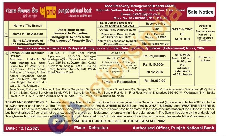 Flat No. 11, First Floor, Kumar Apartment, 55/5-6/2, Village-Wadagaon (B.K) Taluka Haveli, Pune Area: 925 Sq. ft., Owner: Smt. Kamal Suryabhan Sangle, East S.No 55 (Part), North- S.No 55(Part), West-Road, South-Road.
