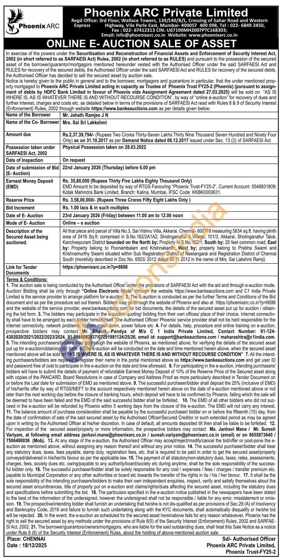 All that piece and parcel of Villa No.3, Sai Vishnu Villa, Akkarai, Chennai-600119 measuring 5834 sq.ft. having plinth area of 2416 Sq.ft. comprised in S.No. 162/2A1A2. Sholinganaliur II Vilage. 101/3, Akkarai, Shoinganallur Taluk, Kancheepuram District bounded on the North by: Property in S.No. 162/1; South by: 20 feet common road; East by: Property belong to Poonambalam and Krishnakanth; West by; property belong to Prabha Swami and Krishnamurthy Swami situated within Sub Registration District of Neelangarai and Registration District of Channal South (morefully described in Doc No. 6503/ 2012 dated 30.11.2012 in the name of Mrs. Sai Lakshmi Ramj)