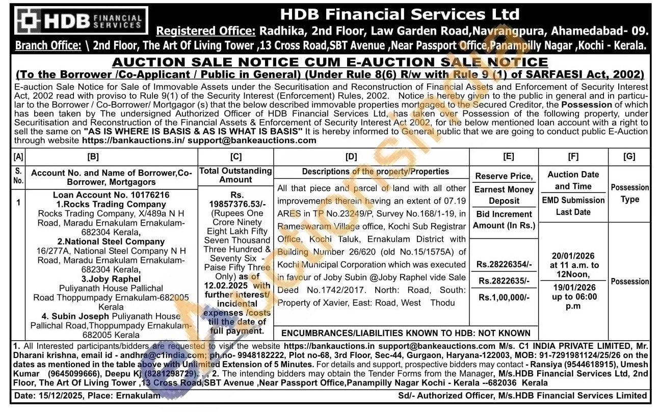 All that piece and parcel of land with all other improvements therein having an extent of 07.19 ARES in TP No.23249/P, Survey No. 168/1-19, in Rameswaram Village office, Kochi Sub Registrar Office, Kochi Taluk, Ernakulam District with & Building Number 26/620 (old No.15/1575A) of Kochi Municipal Corporation which was executed in favour of Joby Subin @Joby Raphel vide Sale Deed No.1742/2017. North: Road, South: Property of Xavier, East: Road, West Thodu