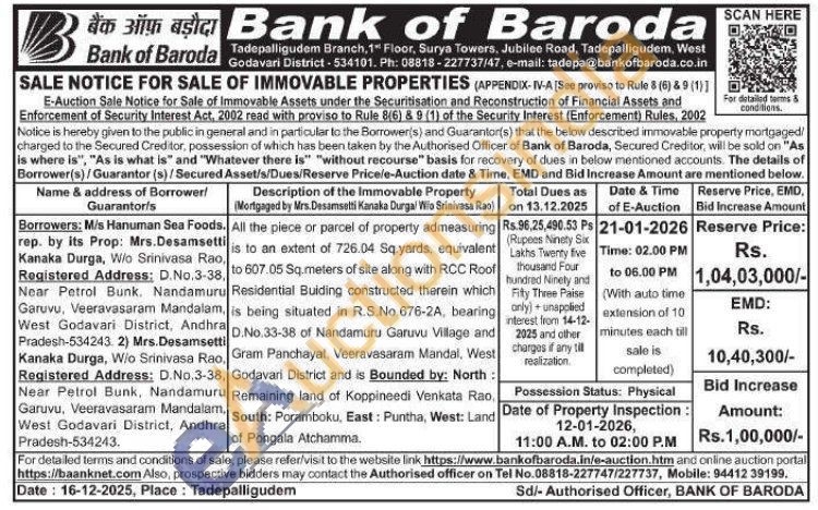 All the piece or parcel of property admeasuring is to an extent of 726.04 Sq yards, equivalent to 607.05 Sq.meters of site along with RCC Roof Residential Buiding constructed therein which is being situated in R.S.No.676-2A, bearing D.No.33-38 of Nandamuru Garuvu Village and Gram Panchayat, Veeravasaram Mandal, West Godavari District and is Bounded by: North: Remaining land of Koppineedi Venkata Rao. South: Poramboku, East: Puntha, West: Land of Pongala Atchamma.