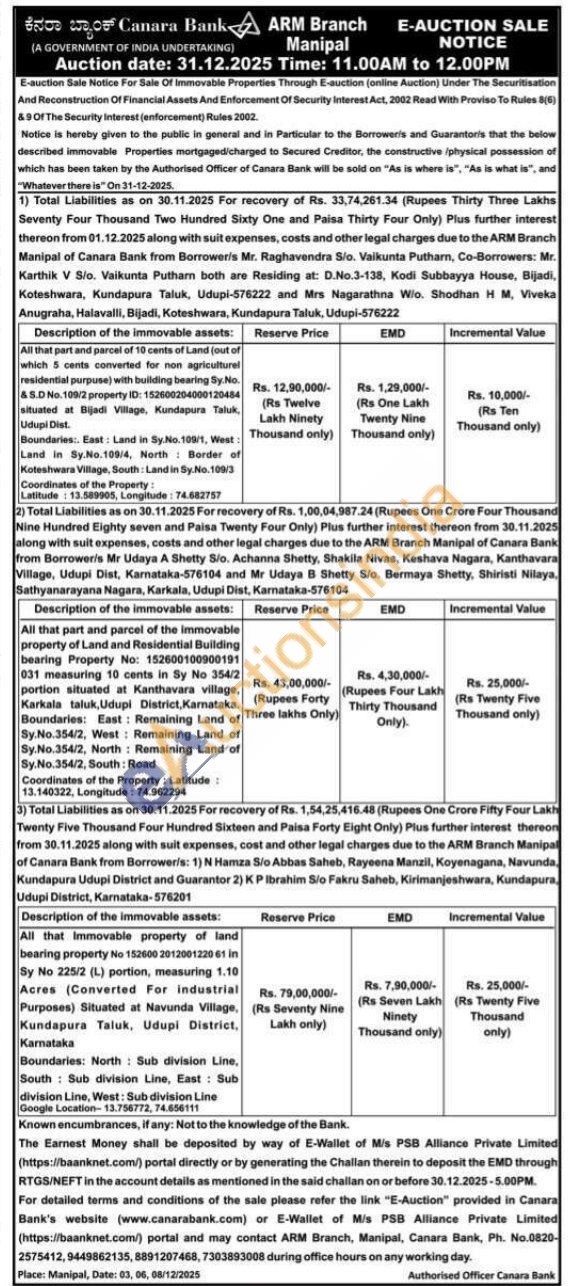 All that part and parcel of the immovable property of Land and Residential Building bearing Property No: 152600100000191 031 measuring 10 cents in Sy No 354/2 portion situated at Kanthavara village, Karkala taluk, Udupi District, Karnataka. Boundaries: East: Remaining Land of Sy.No.354/2, West: Remaining Land of Sy.No.354/2, North Remaining Land of Sy.No.354/2, South: Road