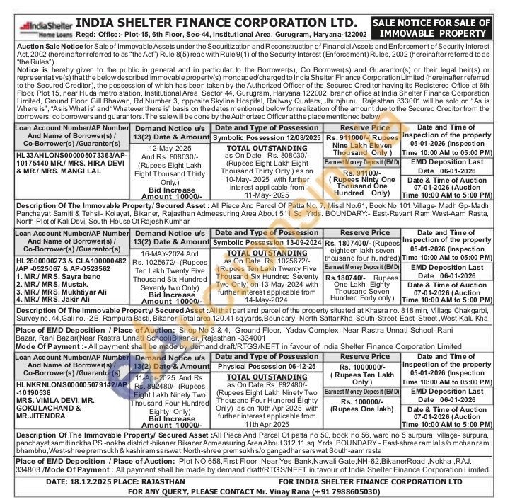 Description Of The Immovable Property/Secured Asset: All that part and parcel of the property situated at Khasra no. 818 min, Village Chakgarbi, Survey no. 44, Galino.-2B, Rampura Basti, Bikaner. Total area 120.41 sqyards, Boundary:-North-Sattar Kha, South-Street, East-Street, West-Kalu Kha