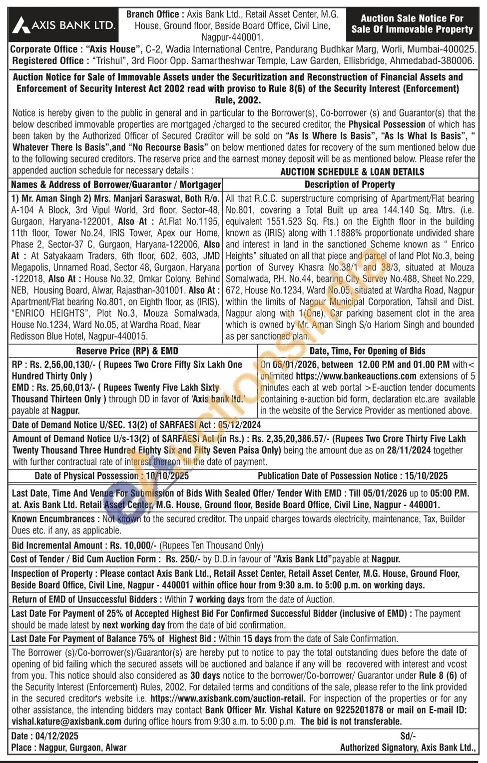 All that R.C.C. superstructure comprising of Apartment/Flat bearing No.801, covering a Total Built up area 144.140 Sq. Mtrs. (i.e. equivalent 1551.523 Sq. Fts.) on the Eighth floor in the building known as (IRIS) along with 1.1888% proportionate undivided share and interest in land in the sanctioned Scheme known as Enrico Heights situated on all that piece and parcel of land Plot No.3, being portion of Survey Khasra No.38/1 and 38/3, situated at Mouza Somalwada, P.H. No.44, bearing City Survey No.488, Sheet No.229, 672, House No.1234, Ward No.05, situated at Wardha Road, Nagpur , within the limits of Nagpur Municipal Corporation, Tahsil and Dist. Nagpur along with 1(One), Car parking basement clot in the area which is owned by Mr. Aman Singh S/o Hariom Singh and bounded as per sanctioned plan.