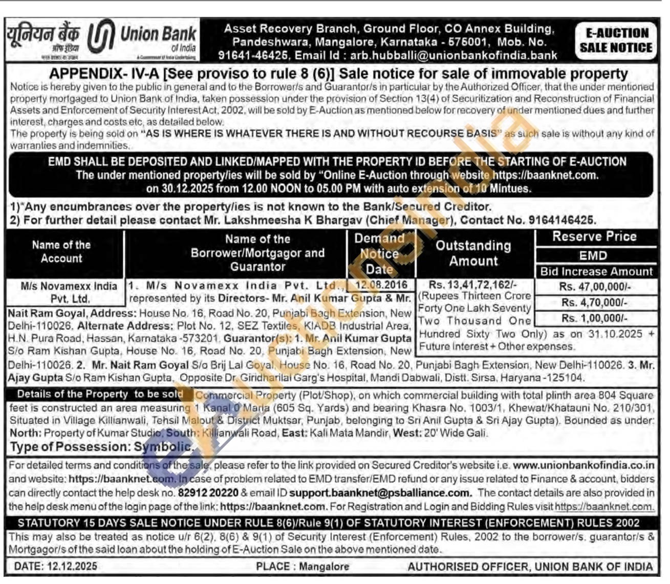 Commercial Property (Plot/Shop), on which commercial building with total plinth area 804 Square feet is constructed an area measuring 1 Kanal 0 Maria (605 Sq. Yards) and bearing Khasra No. 1003/1, Khewat/Khatauni No. 210/301, Situated in Village Killianwali, Tehsil Malout & District Muktsar, Punjab, belonging to Sri Anil Gupta & Sri Ajay Gupta). Bounded as under: North: Property of Kumar Studio, South: Killianwali Road, East: Kali Mata Mandir, West: 20' Wide Gali.