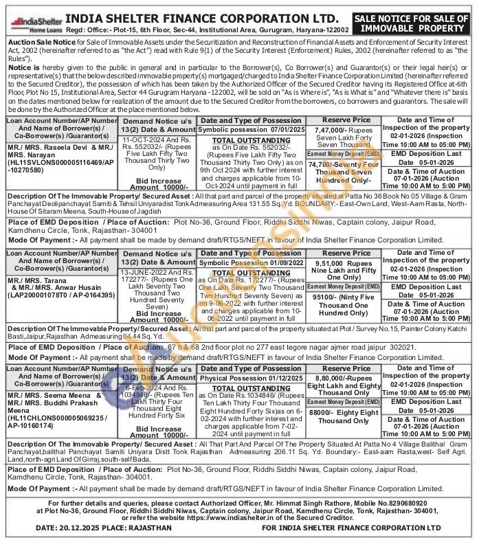 Description Of The Immovable Property/ Secured Asset: All that part and parcel of the property situated at Patta No 36 Book No 05 Village & Gram Panchayat Deolipanchayat Samiti & Tehsil Uniyaradist Tonk Admeasuring Area 131.55 Sq. Yd. BOUNDARY:-East-Own Land, West-Aam Rasta, North-House Of Sitaram Meena, South-House of Jagdish