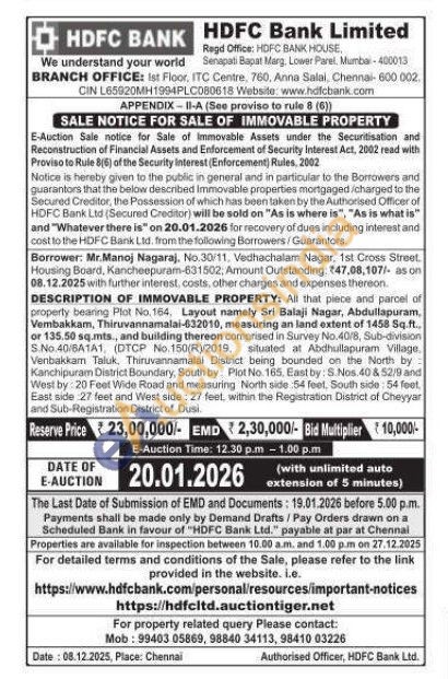 DESCRIPTION OF IMMOVABLE PROPERTY: All that piece and parcel of property bearing Plot No. 164, Layout namely Sri Balaji Nagar, Abdullapuram, Vembakkam, Thiruvannamalai-632010, measuring an land extent of 1458 Sq.ft., or 135.50 sq.mts., and building thereon comprised in Survey No.40/8, Sub-division S.No 40/6A1A1, (DTCP No.150(R)/2019. situated at Abdhullapuram Village, Venbakkam Taluk, Thiruvannamalai District being bounded on the North by Kanchipuram District Boundary, South by Plot No. 165, East by: S.Nos. 40 & 52/9 and West by: 20 Feet Wide Road and measuring North side 54 feel, South side 54 feet. East side 27 feet and West side: 27 feet within the Registration District of Cheyyar and Sub-Registration District of Dusi