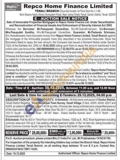 DESCRIPTION OF THE PROPERTY; A Schedule: All that piece and parcel of Guntur District Tenali District Registrar, Tenali Municipal Town Survey, Tenali Village, D. Nos 420/5, 420/6, 420/7 and 4208, an extent of 47.89 sq yards = 40.04 sq mtrs, of house site, being undivided and unspecified area ou of the total extent of 1016.4 sq yards, Near Door No.29-1-1, being bounded by: East: 30 ft. wide Bazaar 103-0 South Goldanka Road 90-00 West Edara Santha Kuman land 100-0 North Jet Sivaramalah land:90-0 B Schedule: Flat No 403 in Third Floor of Aishwarya Towers, 1026 sq ft, RCC Roof Apartment including common area and 100 sq.ft. Car parking with alf easernent nights, in the 1st item etc, being bounded by East: Common Corridor South: Open to Sky West: Open to Sky North: Open to Sky