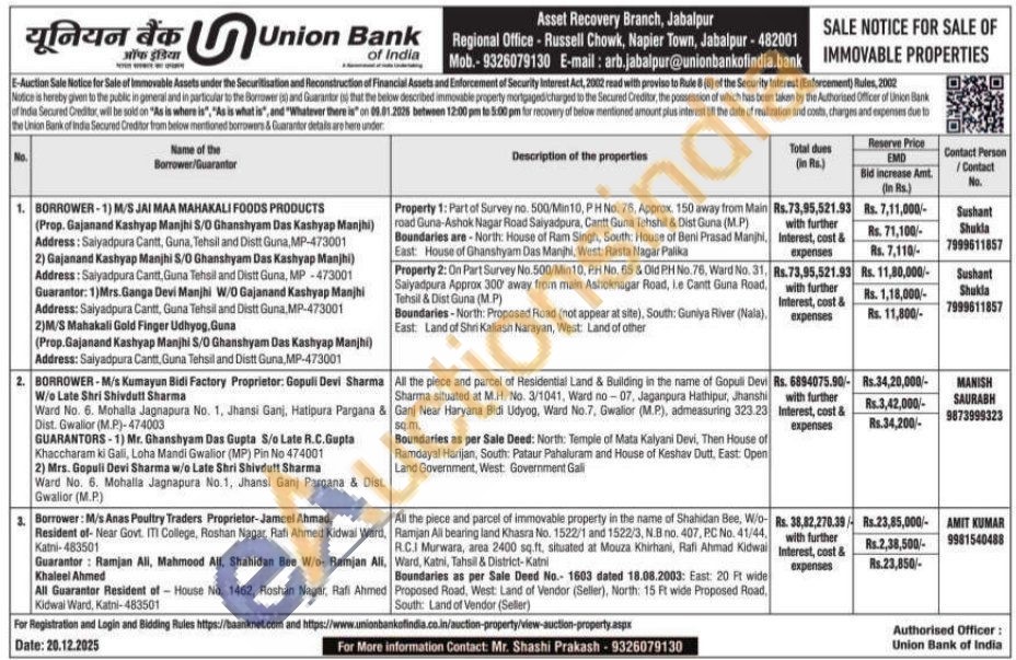 All the piece and parcel of Residential Land & Building in the name of Gopuli Devi Sharma situated at M.H. No. 3/1041, Ward no-07, Jaganpura Hathipur, Jhanshi Ganj Near Haryana Bidi Udyog, Ward No.7, Gwalior (M.P.), admeasuring 323.23 sq.m. Boundaries as per Sale Deed: North: Temple of Mata Kalyani Devi, Then House of Ramdayal Harijan, South: Pataur Pahaluram and House of Keshav Dutt, East: Open Land Government, West: Government