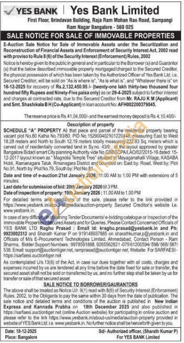 Description of property : SCHEDULE "A" PROPERTY All that piece and parcel of the residential property bearing vacant plot No.80 Katha No. 793/80, PID No. 152900402101220448, measuring East to West 18.28 meters and North to South 12.19 meters totally measuring 222.83 Sq. meters which is carved out of residentially converted land in Sy.no. 43/9, of the layout approved by greater Bangalore Bidadi smart City planning Authority vide No. GBBSCPA/LAO/02/2015-16 dated: 15-12-2017 layout known as Magnolia Temple Tree" situated at Mayaganahalli Village, KASABA Hobli, Ramanagars Taluk, Rmanagara District and bounded on: East by: Road, West by: Plot No.91, North by: Plot No. 79, South by: Plot No.81